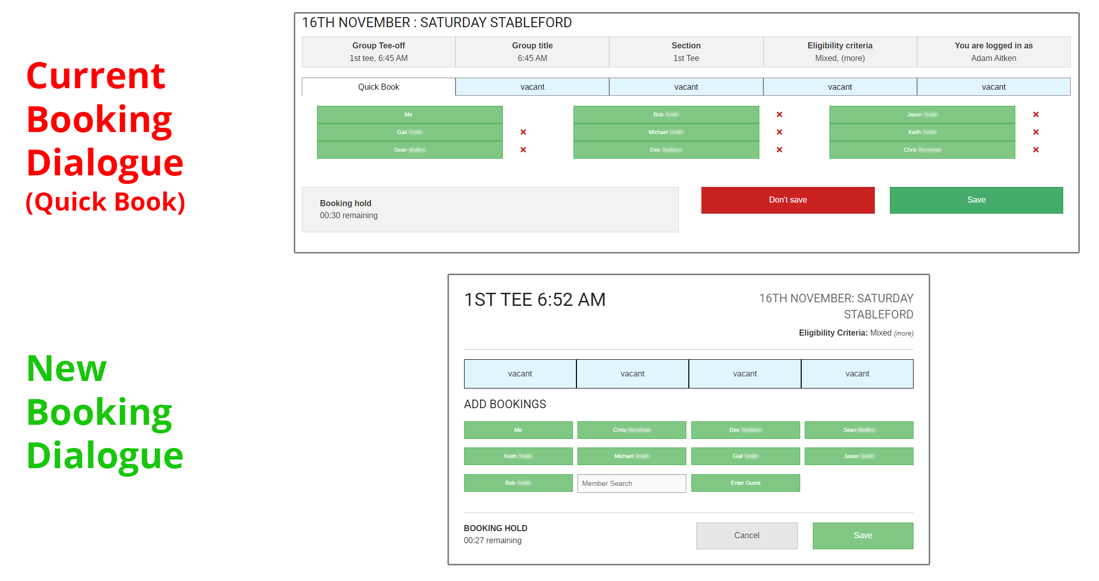To demonstrate the changes, here is a short video of a player making a group booking from beginning to end. The player will add themselves, two playing partners, add the final booking from the search box, and finally save the group.